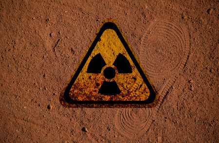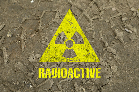 A radiation warning sign on a background of soil. Close up.