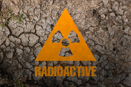 Orange radioactive sign on cracked dry earth, top view. Radiological pollution