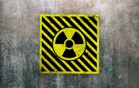 radiation hazard warning sign on the wall at forbidding entry aria to a radioactive zone.
