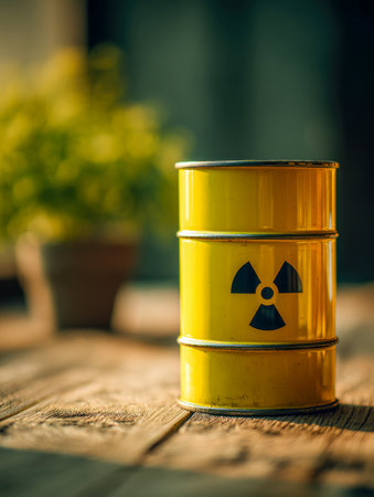 A bright yellow metallic canister featuring a prominent radioactive warning icon rests on aged wooden planks, with lush greenery softly blurred in the background under ge