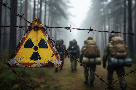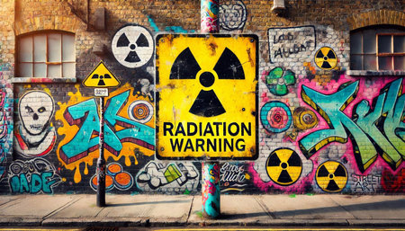 Generative AI Close-up of radioactive warning signs at Chernobyl, weathered warnings, haunting atmosphere, detailed linework, atmospheric scene