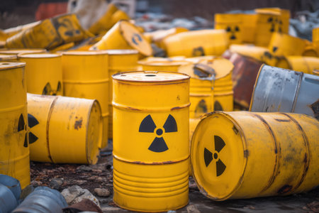 A collection of yellow barrels marked with black radiation symbols signifies nuclear waste, highlighting the environmental and safety concerns associated with nuclear energy and the controversial aspects of Iran's nuclear program and potential conflict.