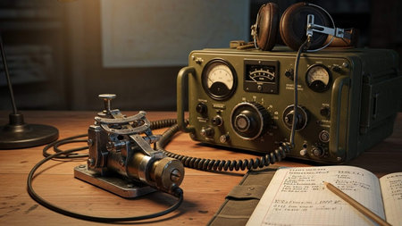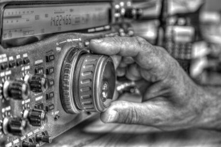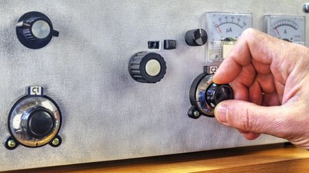 Selective focus of mans hand on a telegraph key with radio defocused in background