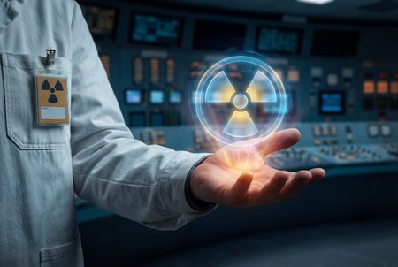 A nuclear scientist in a white coat with a badge stands in a control room holding a glowing holographic radiation symbol above his open palm while surrounded by control panels and digital screens.