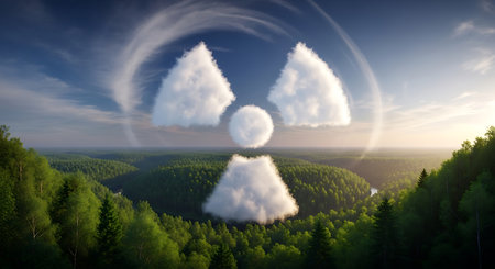 View of nuclear power plant with cooling towers emitting steam and red radiological symbol reflecting the complex relationship between energy production and environmental concerns.