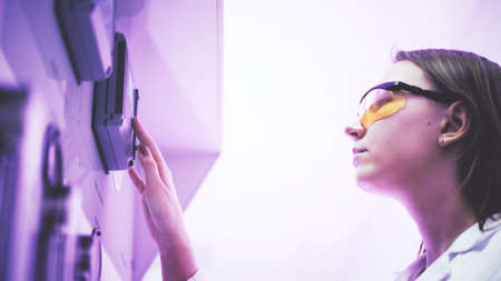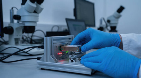 A researcher wearing blue gloves works with a device in a laboratory. The setting includes several microscopes and various equipment. The process involves careful handling and observation.