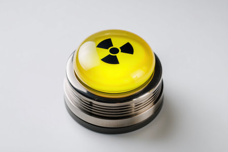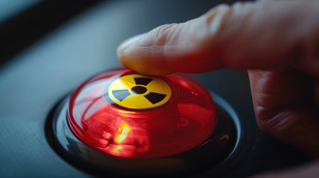 An individual is pressing a bright red button with a yellow radioactive symbol on it.