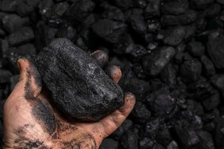 Male hand with coal on the background of a heap of coal, coal mining in an open pit quarry, copy space. Fossil fuels, environmental pollution