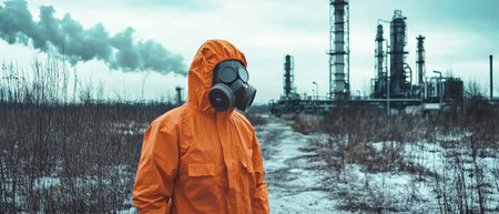 A man clad in an orange suit and gas mask observes a chemical plant, highlighting the significance of safety in industrial environments.