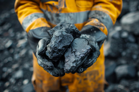 Closeup Miner holds coal palm. Concept mining, Top view