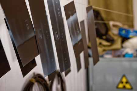 Radiographic images of welded joints of pipelines are hanging on the line in the darkroom