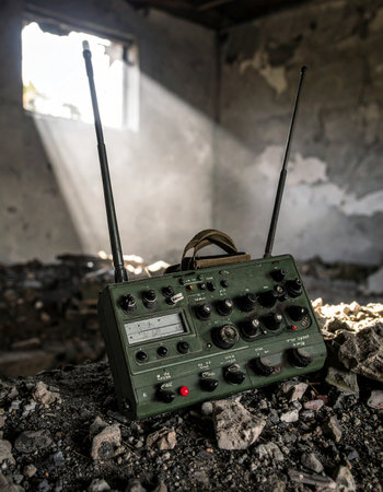 In the quiet of a forgotten, derelict building, a single beam of light illuminates a relic from a past conflict. This vintage military radio, once a vital link for secret communications, now sits silently amidst the rubble and dust, a poignant symbol of lost signals and forgotten histories.