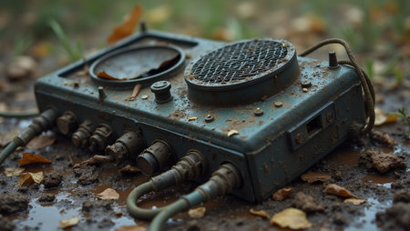 Abandoned military radio set in mud with cracked speaker symbolizing broken communication