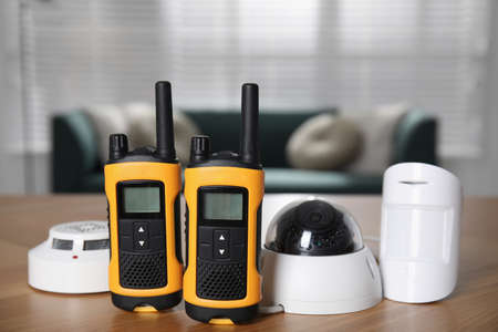 CCTV camera, walkie talkies, smoke and movement detectors on wooden table indoors. home security system