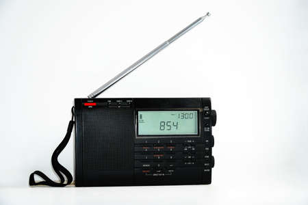 Retro radio receiver on white isolated background. Flat lay, top view.