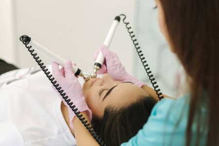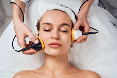 Young woman receiving electric galvanic anti-aging face spa massage at beauty salon. Galvanic massage helps to speed up metabolism, improve regeneration and restore skin protection from harmful external factors.