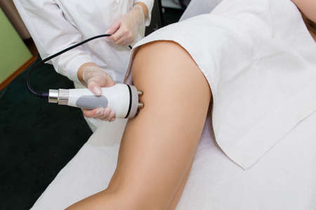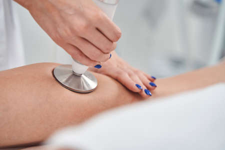 Hands of cosmetologist applying tool for ultrasound cavitation on the leg of woman during beauty treatment