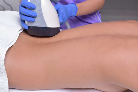 Rf skin tightening, belly. Hardware cosmetology. Body care. Non surgical body sculpting. Ultrasound cavitation body contouring treatment, anti-cellulite and anti-fat therapy in beauty salon.