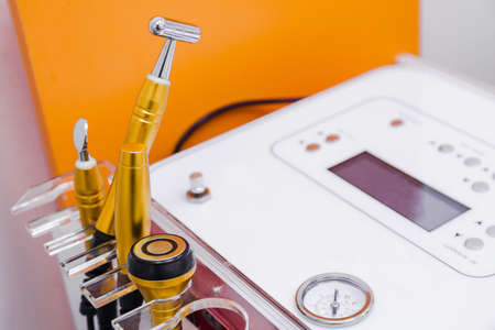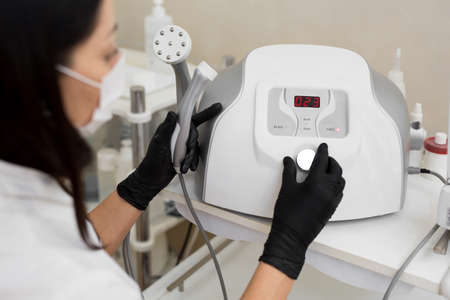 Close-up of a cosmetologist includes a mesotherapy medical device. Close-up of medical equipment in a cosmetology clinic. Skin care.