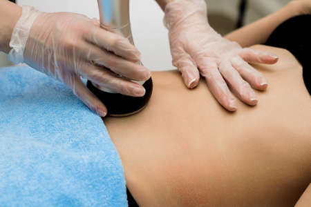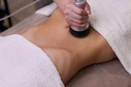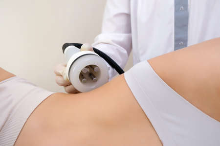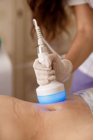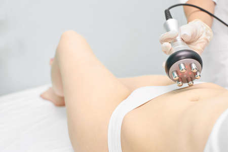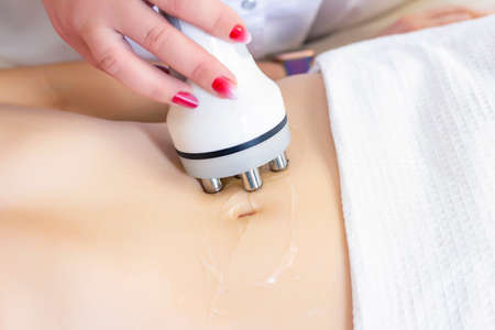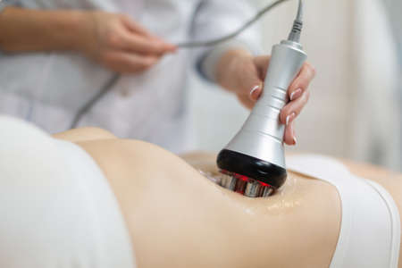 procedure removing cellulite on female abdomen, cavitation belly massage. Ultrasonic massage for weight loss. Correction of female figure without surgical intervention. Closeup of the tummy.