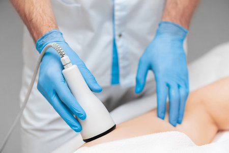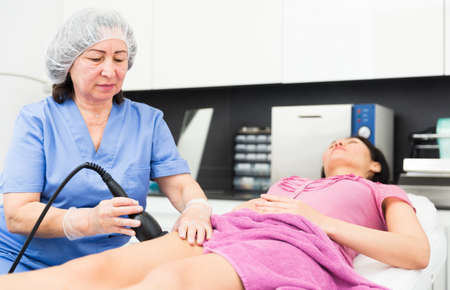 Cosmetologist performing ultrasound cavitation for female client thighs