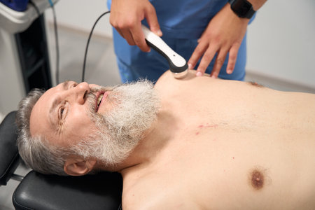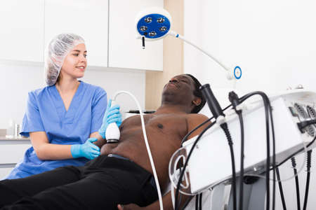 Cosmetologist performing ultrasound cavitation body procedure for man