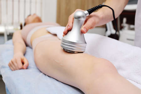 Hardware cosmetology. Body care. Spa treatment. Ultrasound cavitation body contouring treatment. Woman getting anti-cellulite and anti-fat therapy in beauty salon