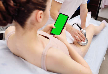 Hardware cosmetology. Body care. Spa treatment. Ultrasonic cavitation body contouring treatment. A woman receives anti-cellulite and anti-fat therapy in a beauty salon.
