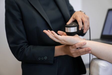 Close up on hand of unknown caucasian therapist holding ultrasonic ultrasound head transducer on back of patient in treatment using medical equipment to reduce pain - healthcare and medicine concept