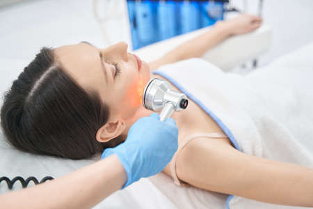 Hardware cosmetology. Close up picture of lovely young woman with closed eyes receiving rf lifting procedure in beauty salon.