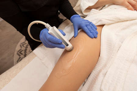 Ultrasound massage closeup on woman's thigh. Modern hardware cosmetology.