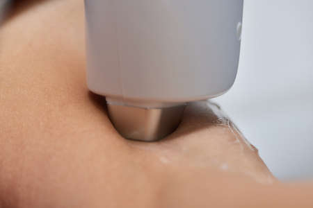 Closeup of woman receiving laser epilation treatment in beauty salon