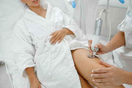 Woman getting anti cellulite and fat therapy in beauty salon. Hardware cosmetology, radio frequency lifting
