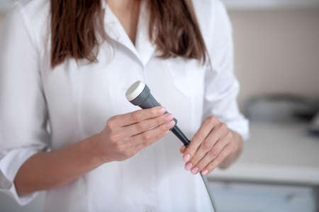 Close up of an ultrasound machine in the hands of a female doctor