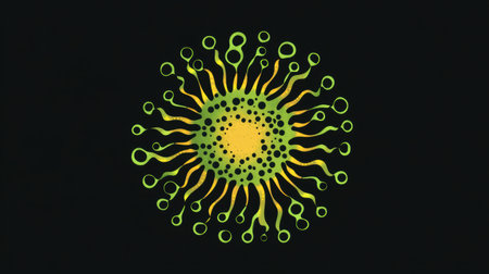 Vibrant virus illustration shows a central core with tendrils radiating on a dark backdrop, creating a striking visual effect.