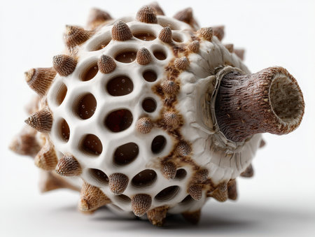 Organic, intricate sea shell with textured surface and protruding spikes. Natural colors of brown and white, showing attention to detail and geometric patterns