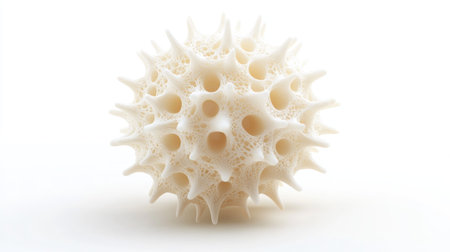 A detailed view of a white, spherical object covered in numerous sharp, pointed protrusions, resembling a virus or pollen grain.