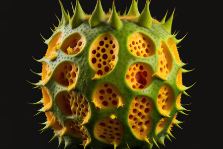 This digital illustration presents a close-up view of a virus. Its a study in contrast, with the deep black background making the characteristics of the virus stand out. The virus appears spherical and dotted with spots, giving it a distinctive look. Theres a certain beauty in its microscopic intricacy, quite similar to the delicate beauty found in underwater organisms like sea slugs. The intensity of the image is further heightened by the subtle undertones of danger and a sense of the unknown, given its depiction of a virus. All in all, this image is a compelling portrayal of the microscopic world, revealing the aesthetics hidden beneath the surface of things unseen by the naked eye.