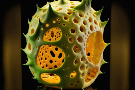 A detailed shot of a unique marine organism, featuring numerous sharp spines and a porous, irregular surface, highlighting its intricate biological structure.