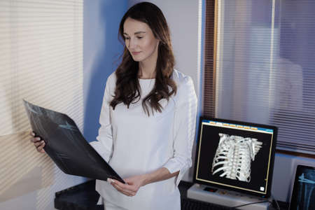 Young serious female radiologist looking at x-ray image after radiological examination of patient while standing in medical office