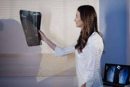 Female doctor holding Xray film in hospital diagnosing bone disease Copy space for text. Concept Medical, Female Doctor, X-ray, Hospital, Bone Disease