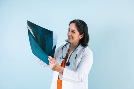 hispanic woman doctor looks at xray radiography images in radiology clinic on blue background in Mexico Latin America