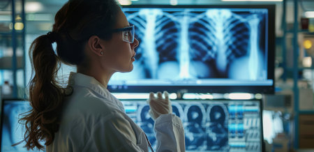 Healthcare worker analyzing X-ray of lungs, medical charts and screens in background