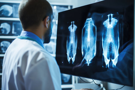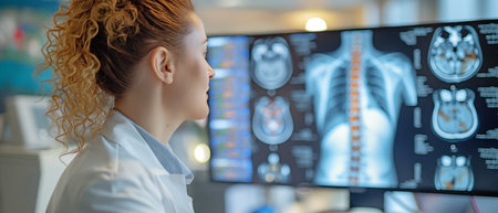 Medical professional reviewing digital Xray image for diagnosis in hospital setting. Concept Medical Imaging, Radiology Diagnosis, Healthcare Technology, Diagnostic Imaging, Hospital Workflow