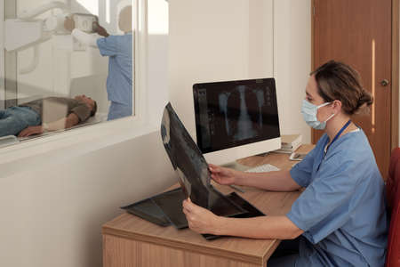 Young female clinician looking at x-ray images of patients while sitting by worplace in front of window of examination room