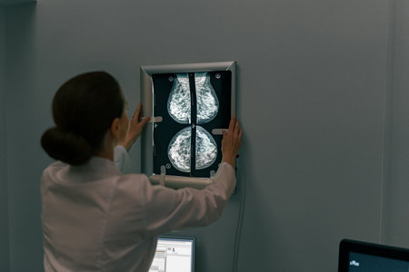 A female doctor carefully examines an x-ray image in her office, analyzing and diagnosing a patients condition with a focused expression.