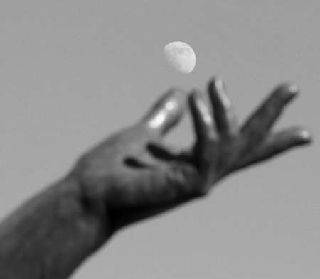hand of statue trying to catch the white moon in the sky