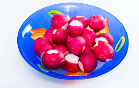 cleaned garden radish in a bowl/fresh garden radish in a garden on sunlight, selective focus