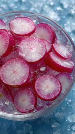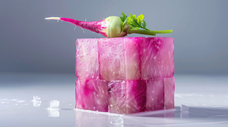 A visually striking arrangement of pink radish cubes topped with fresh greenery captures the essence of modern culinary creativity and freshness.