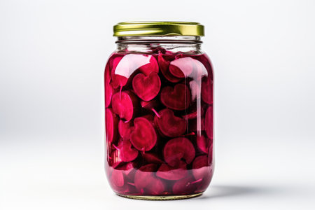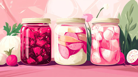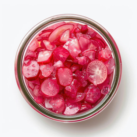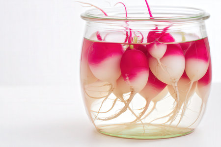 This image showcases vibrant pink radish pickles presented in a clear glass jar, emphasizing freshness and culinary artistry against a simple white background.